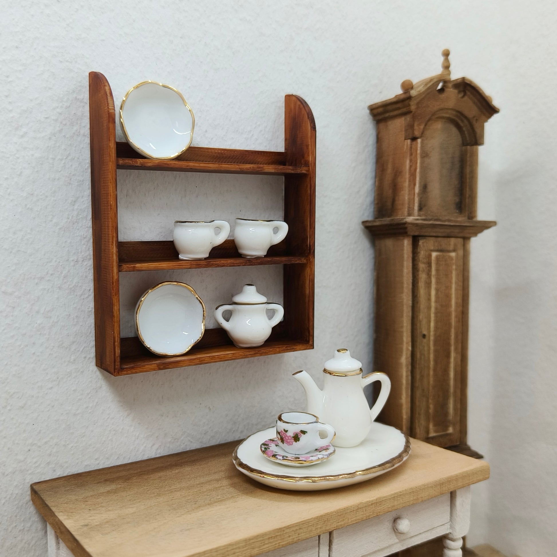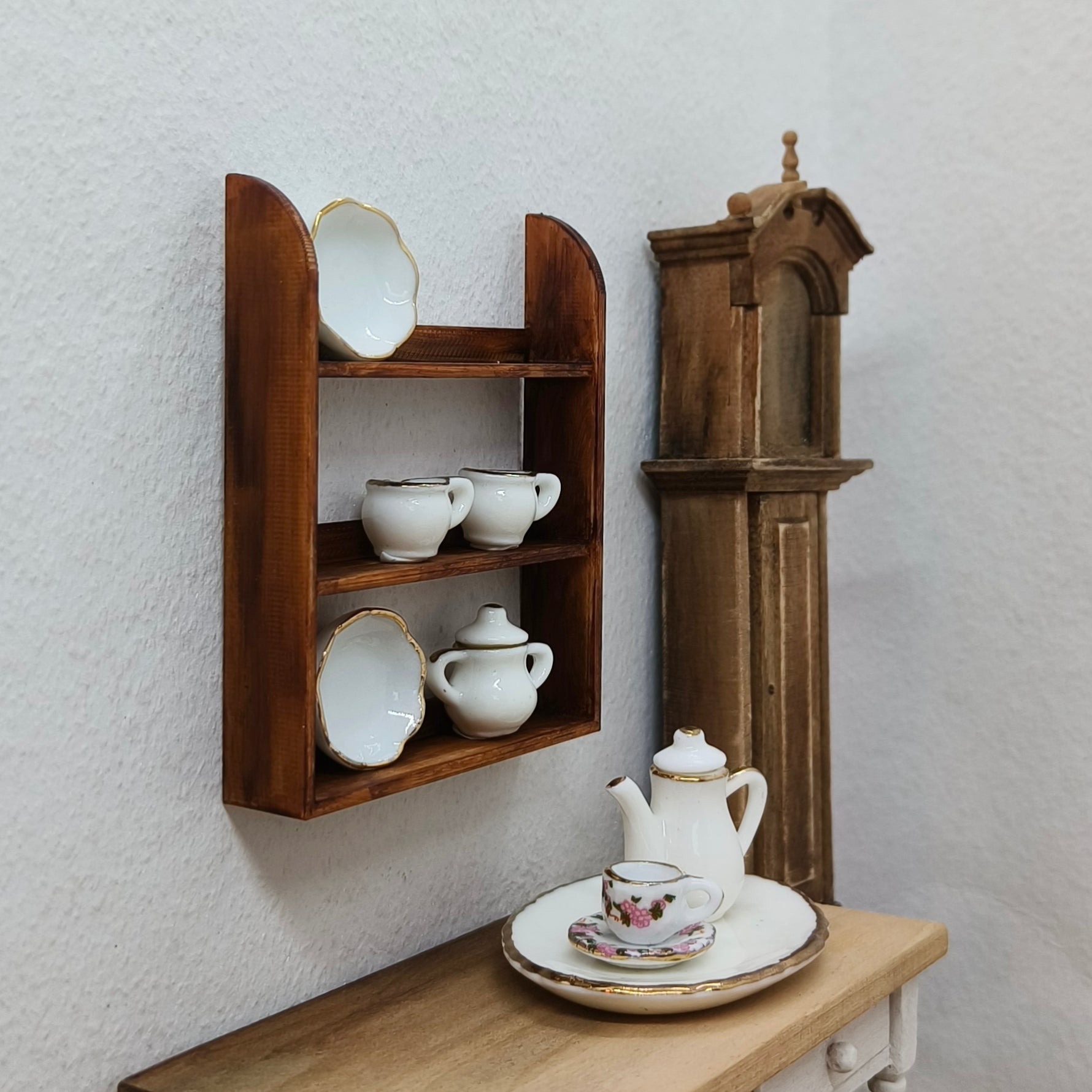 Rustiikkinen astiahylly on kätevä keittiössä tai ruokailupöydän vieressä. Laita esille kauneimmat astiat tai arkikupit nopeasti saataville. Maalattu akryylimaaleilla rustiikkisen näköiseksi. Sopii 1:12 -koon nukkekoteihin ja minimaailmoihin. Voit kiinnittää sen seinään esim. Tacky Gluen valkotarralla, samoin kuin astiat hyllyyn. Valkotarra ei jätä rasvaista jälkeä.
