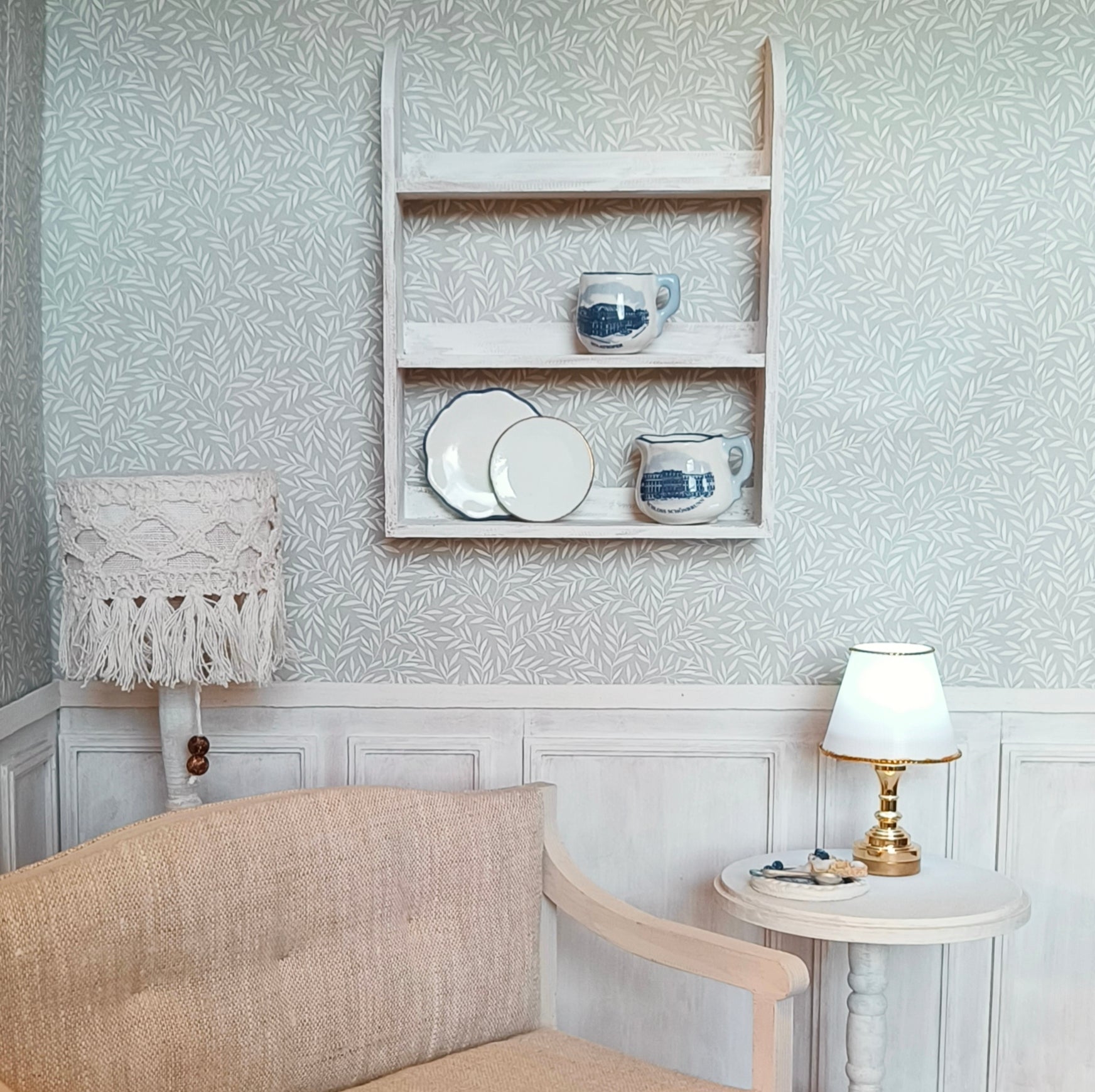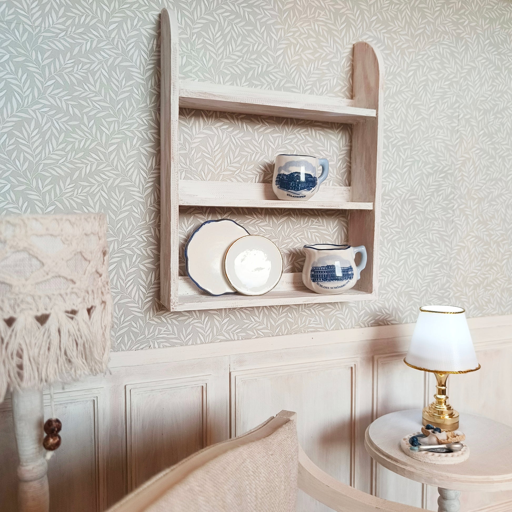 Rustiikkinen astiahylly on kätevä keittiössä tai laita kauneimmat astiat esille muualla. Maalattu kalkkimaalilla rustiikkisen näköiseksi. Sopii 1:16 -koon nukkekoteihin ja minimaailmoihin. Voit kiinnittää sen seinään esim. Tacky Gluen valkotarralla, samoin kuin astiat hyllyyn. Valkotarra ei jätä rasvaista jälkeä.