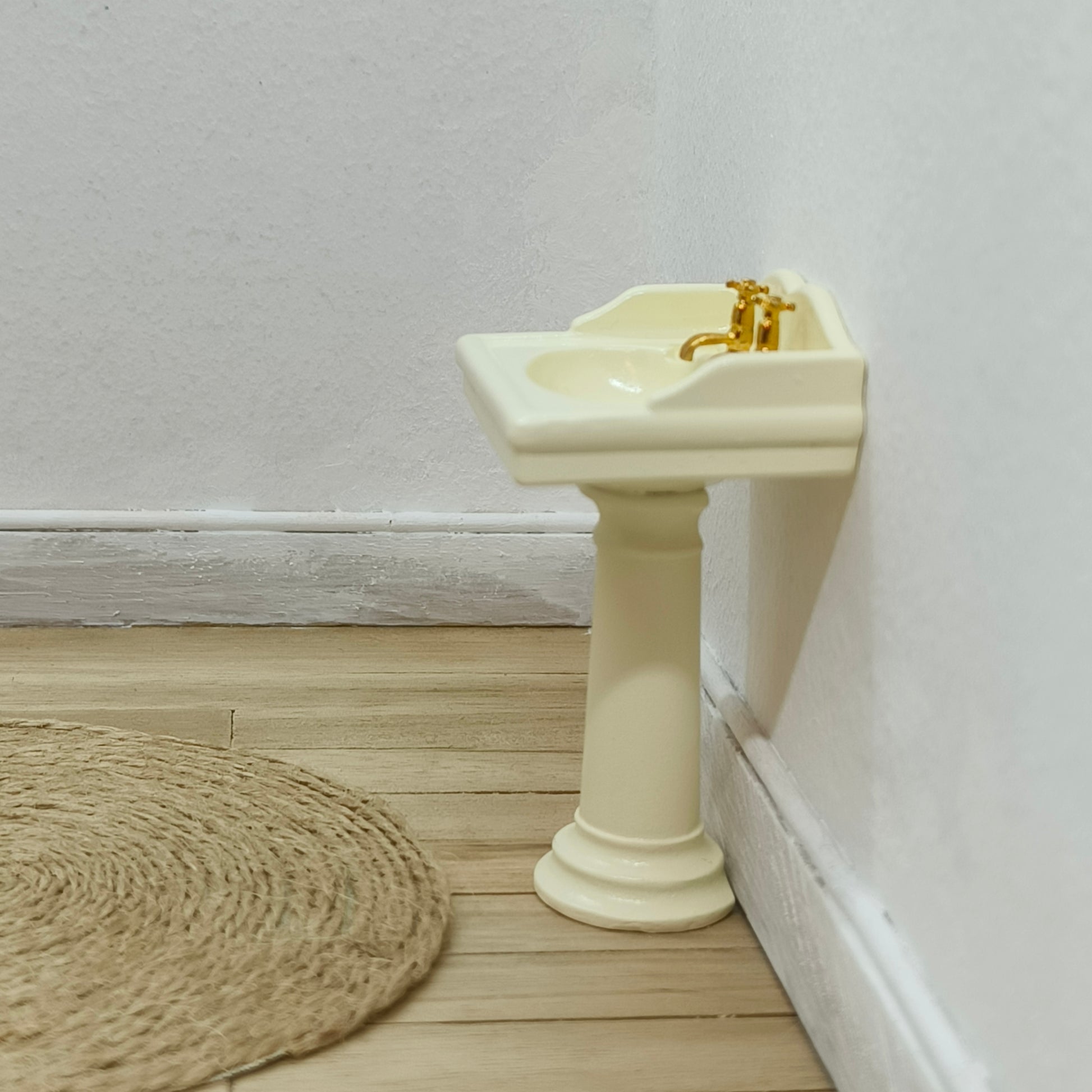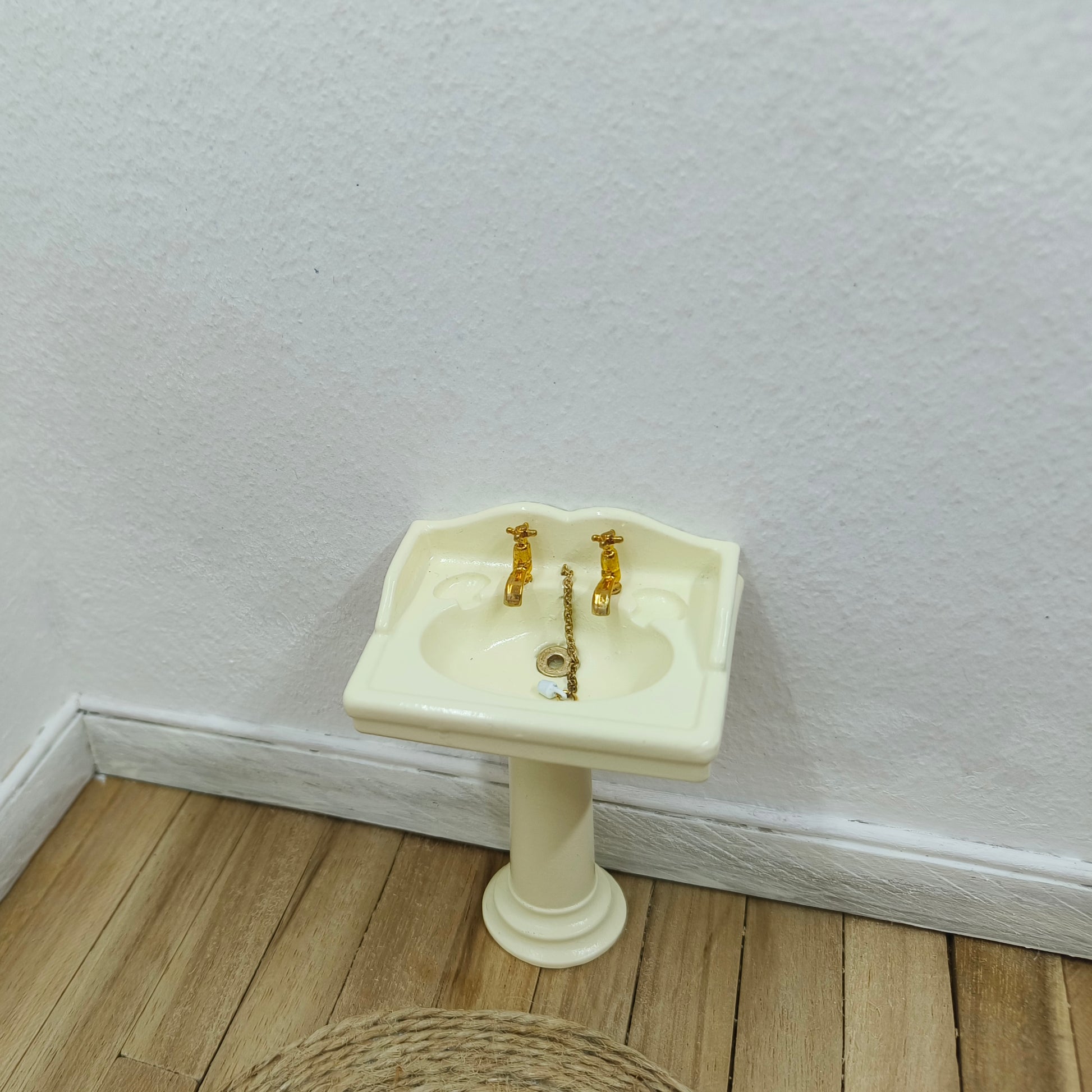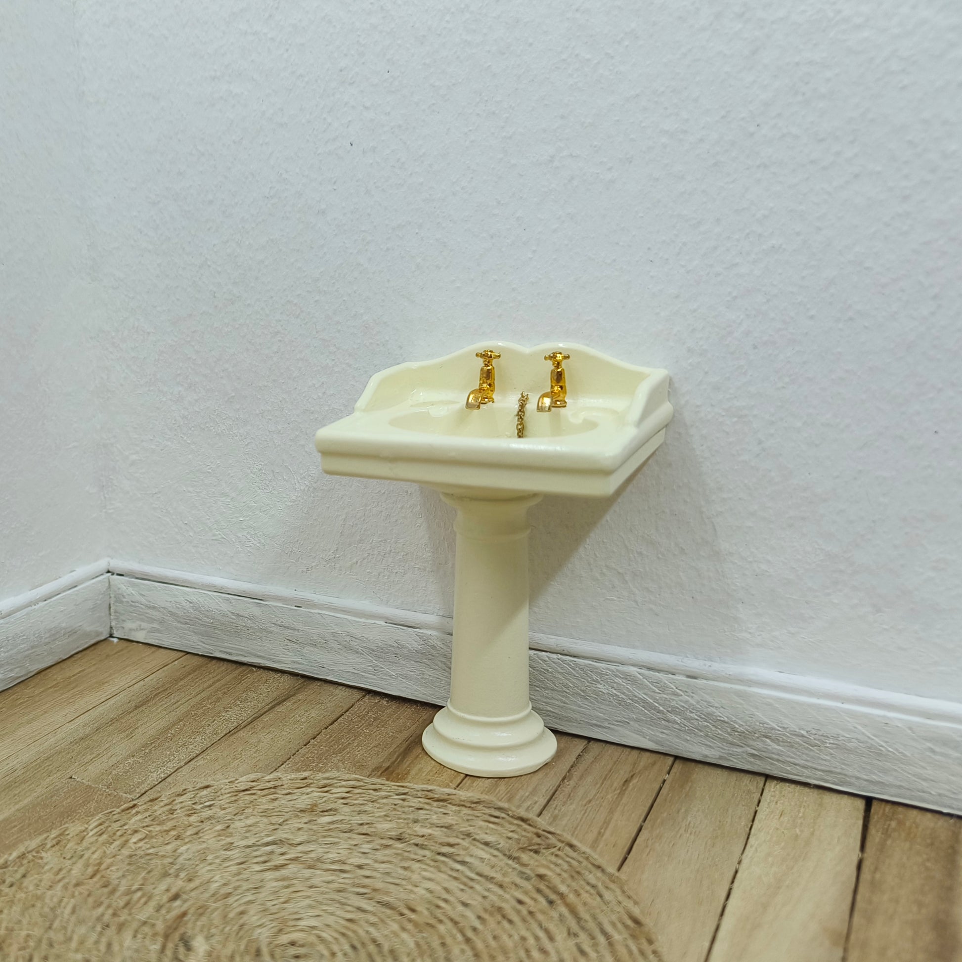 Kaunis vanhanaikainen käsienpesuallas tarkoilla yksityiskohdilla. Altaan reunalla paikat kahdelle saippualle, hanat yksityiskohtaisen tarkat. Altaan pohjassa kultainen viemärin reunus ja tulppa kultaisesa ketjussa. Seisoo itsekseen, mutta voi myös kiinnittää seinään esim. esim. Tacky Gluen valkotarralla . Väri tummahko kerma / hyvin vaalea keltainen.