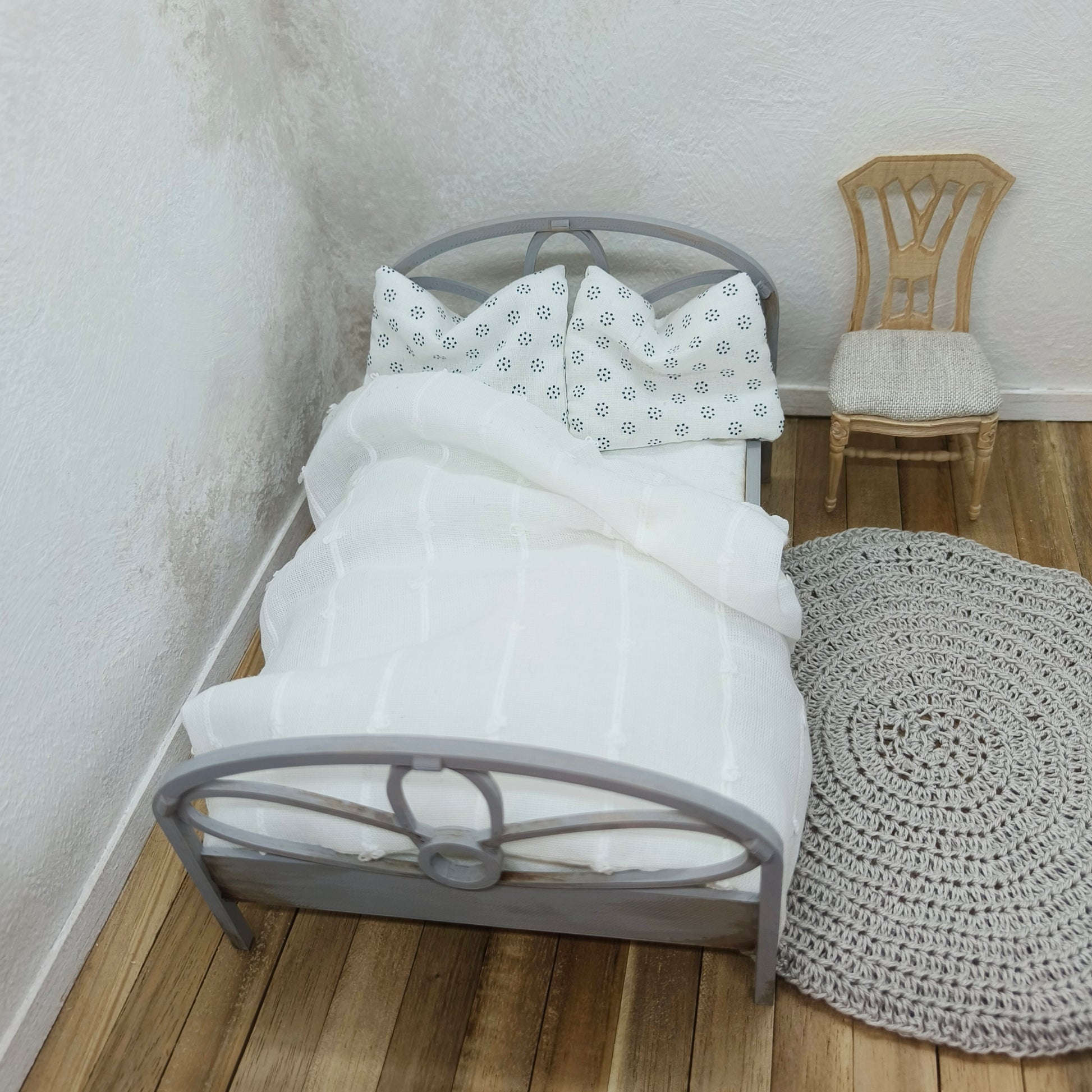 Luo oman näköisesi sänky 1:12 -taloosi. Tuunaa kalkkimaalilla tai akryylimaalilla. PLA -muoviin tarttuvat niiden lisäksi myös erilaiset tussit, jos haluat tuoda jotain yksityiskohtia esiin. Kuvan harmaasävyinen mallikappale on maalattu kalkkimaalilla ja rustiikkiset yksityiskohdat akryylimaalilla. Emme suosittele maalamiseen vesivärejä, ne eivät tartu kalusteeseen. Tee omanlaisesi vuodevaatteet.