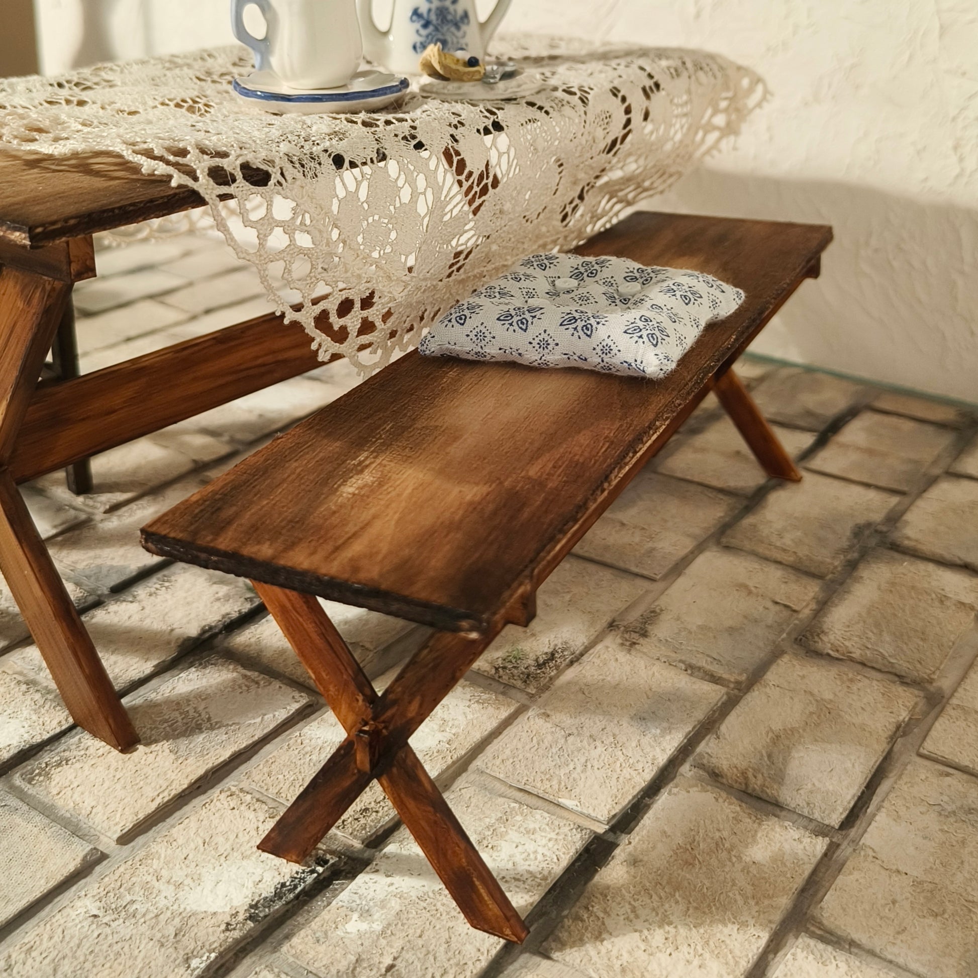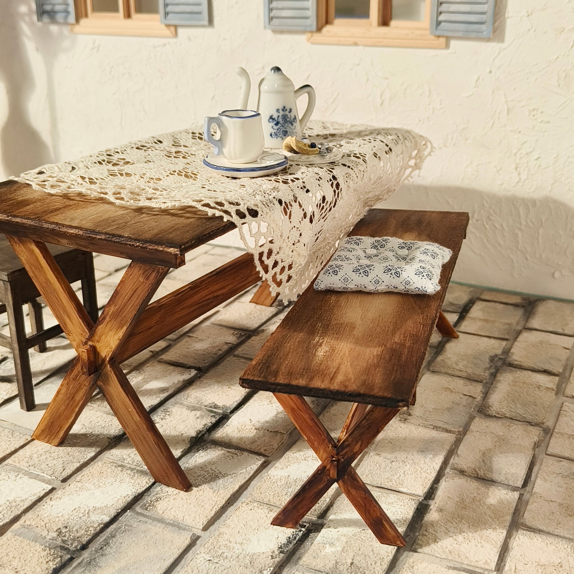 Rustiikkinen ja tukeva neljän hengen pöytä patiolle tai sisälle country -style sisustukseen. Pöydän kansi koivuvaneria ja voit tuunata sen helposti haluamallasi tavalla. Jalkaosa PLA -muovia. Pakkauksessa osat pöytään, penkki ostettavissa erikseen. Kuvattu 1:6 -dioraamassa eli sopii Barbien ja Phicen -nukkien huoneisiin.