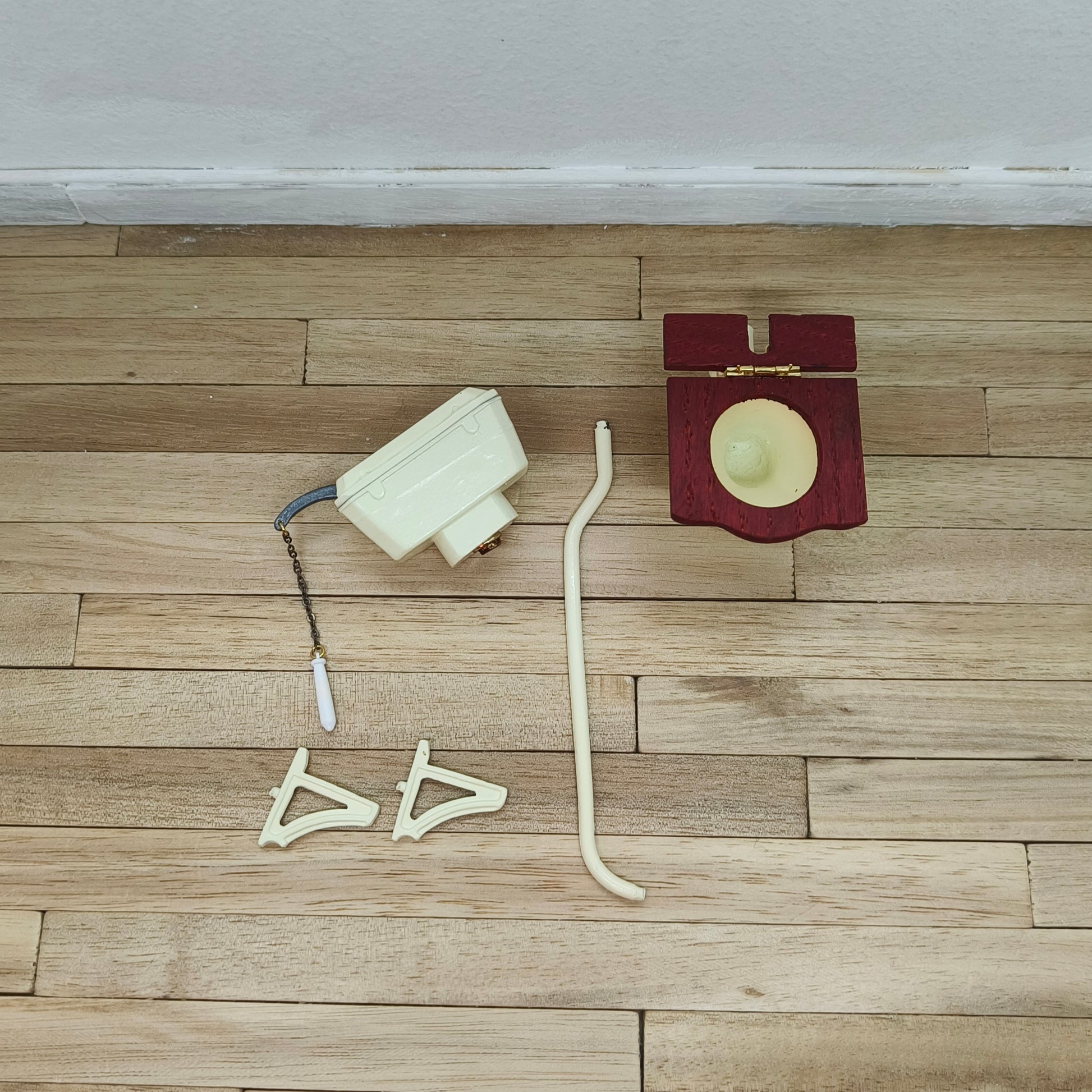 Vanhan aikainen wc- istuin hieman vanhempiin taloihin. Vesisäiliön vipu liikkuu, kun ketjusta vetää. Tuote toimitetaan osissa ja osat voi kiinnittää yhteen esim. pikaliimalla. Vesisäiliön tai sen kannakkeet voi kiinnittää seinään liimalla tai Tacky Glue -valkotarralla.